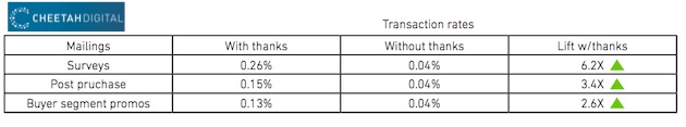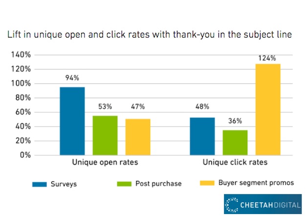 El reporte estuvo basado en datos de 2017 de campañas de correo electrónico enviados por clientes de Cheetah Digital en una amplia variedad de mercados verticales. Los investigadores encontraron líneas de asunto de correos electrónicos que incluyen términos como “con sincero o profundo agradecimiento” y “¡Gracias!”, tenían un promedio de únicamente abiertos y clic único que eran 69% y 38% superiores, respectivamente, a las líneas de asunto que no expresaban gratitud.